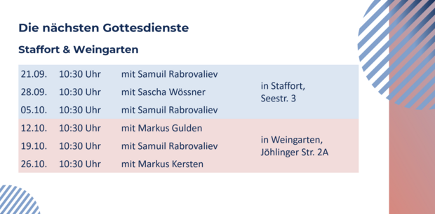 Vom 12.10. bis zum 26.10. finden keine Gottesdienste bei uns im Haus in der Seestraße 3 statt. Wir feiern in dieser Zeit gemeinsame Gottesdienste mit der Liebenzeller Gemeinschaft Weingarten. Die Gottesdienste finden in der Jöhlinger Straße 2A in Weingarten statt.