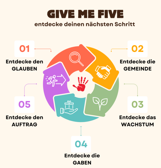 „Give Me Five“ ist ein aufeinander aufbauendes Konzept, das dich in deiner geistlichen Reife Schritt für Schritt weiterführt.